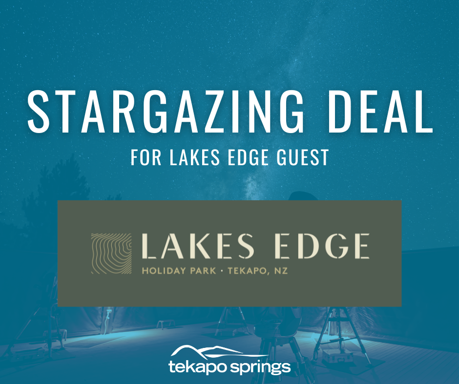 Guests staying at Lakes Edge Holiday Park in Lake Tekapo can enjoy a special discounted rate on Tekapo Star Gazing tours, with both Economy and Premium stargazing tickets available. This exclusive offer allows Lakes Edge guests to experience guided telescope stargazing beneath the Aoraki Mackenzie International Dark Sky Reserve, tickets also including the option to soak in the stars in our iconic hot pools. It’s the perfect way to complement your Lake Tekapo stay with an unforgettable night sky experience. Check out more here.